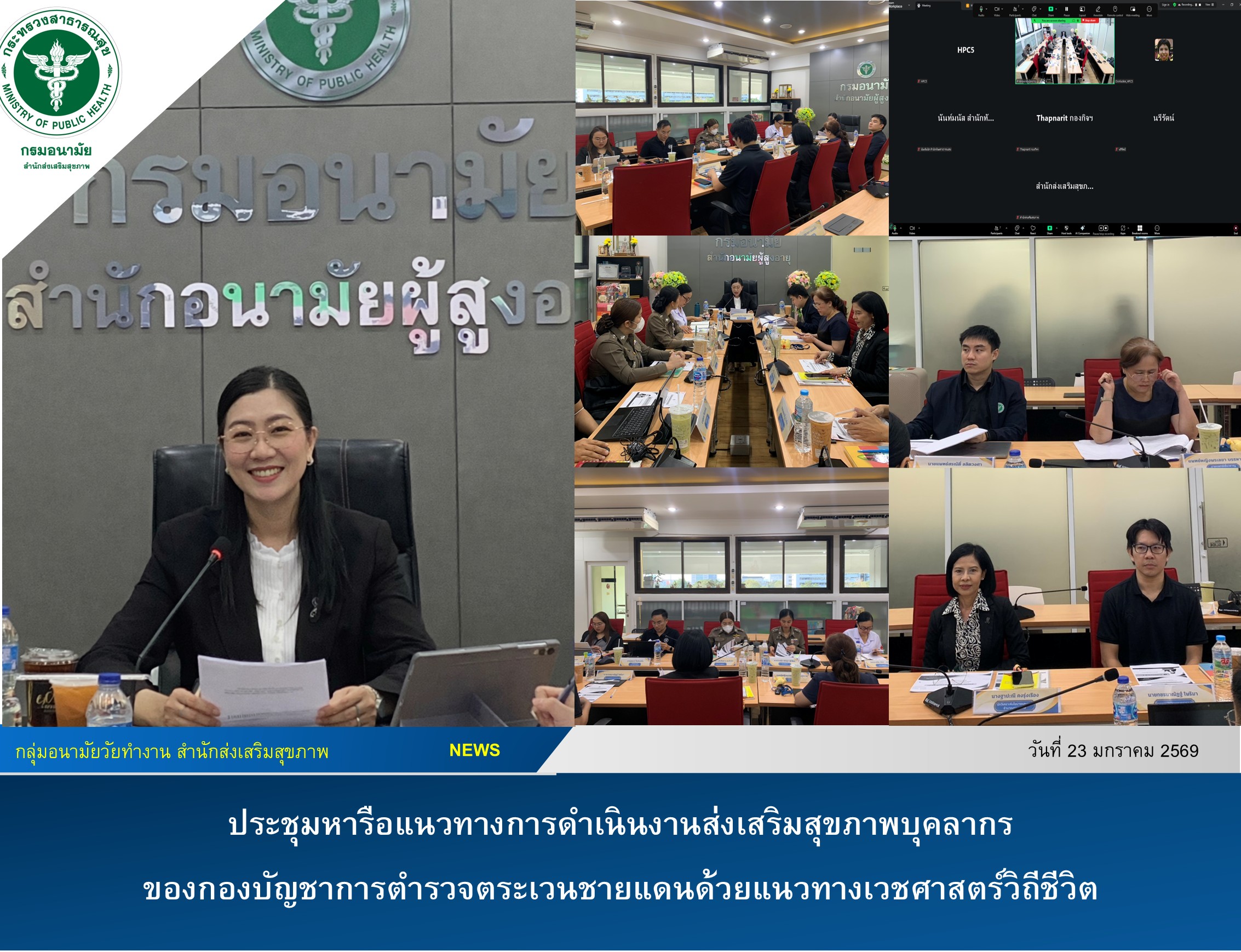 เมื่อวันศุกร์ที่ 23 มกราคม 2569 แพทย์หญิงทิพา ไกรลาศ ผู้อำนวยการสำนักส่งเสริมสุขภาพ มอบหมายให้ แพทย์หญิงพรเลขา บรรหารศุภวาท ผู้ช่วยผู้อำนวยการสำนักส่งเสริมสุขภาพ เป็นผู้แทนเข้าร่วมประชุมสำนักส่งเสริมสุขภาพร่วมกับสถาบันเวชศาสตร์วิถีชีวิต จัดประชุมหารือแนวทางการดำเนินงานส่งเสริมสุขภาพบุคลากรของกองบัญชาการตำรวจตระเวนชายแดนด้วยแนวทางเวชศาสตร์วิถีชีวิต โดยมีแพทย์หญิงสิฏฐินิดา กิตติศิริวัฒนกุล ผู้อำนวยการสถาบันเวชศาสตร์วิถีชีวิต เป็นประธานการประชุม