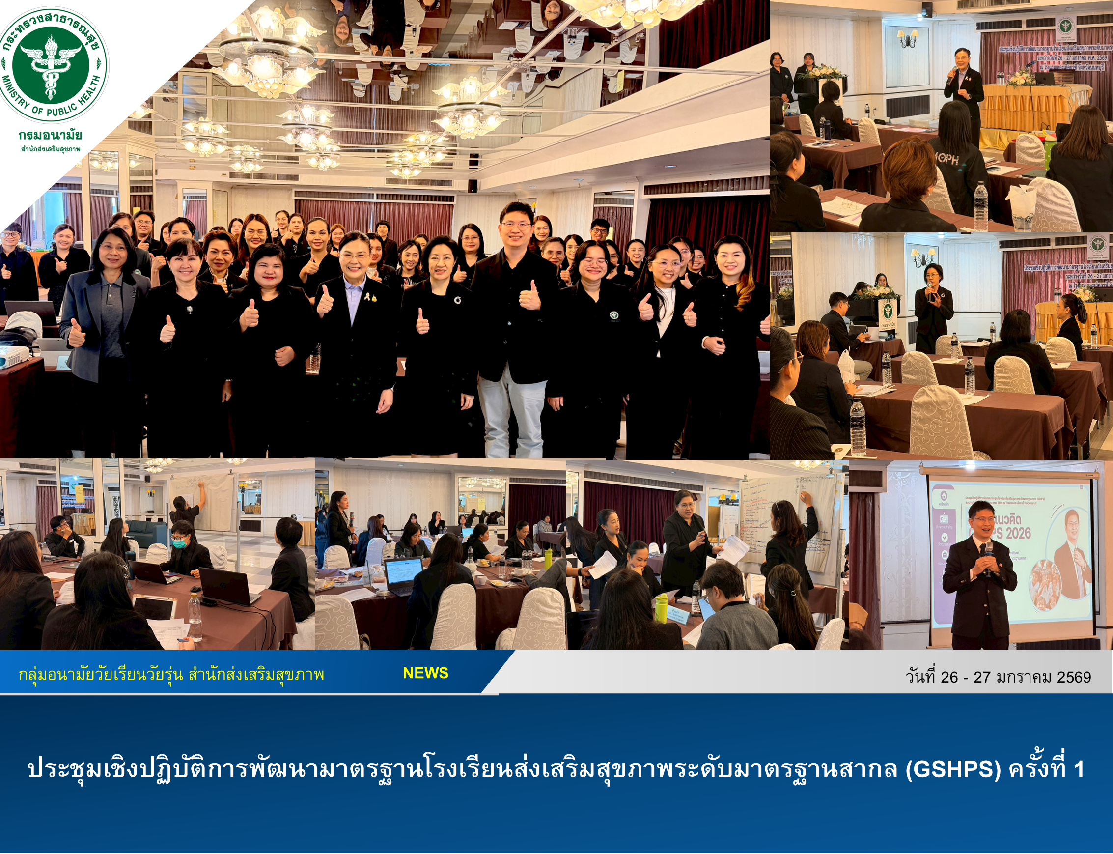 เมื่อวันที่ 27 มกราคม 2569 สำนักส่งเสริมสุขภาพ กรมอนามัย จัดประชุมเชิงปฏิบัติการพัฒนามาตรฐานโรงเรียนส่งเสริมสุขภาพระดับมาตรฐานสากล (GSHPS) ครั้งที่ 1 โดยมีแพทย์หญิงนงนุช ภัทรอนันตนพ รองอธิบดีกรมอนามัย เป็นประธานและวิพากย์ผลการประชุมกลุ่ม พร้อมด้วยแพทย์หญิงทิพา ไกรลาศ ผู้อำนวยการสำนักส่งเสริมสุขภาพ และนายแพทย์สุรัตน์ ผิวสว่าง รองผู้อำนวยการสำนักส่งเสริมสุขภาพและหัวหน้ากลุ่มอนามัยวัยเรียนรุ่น