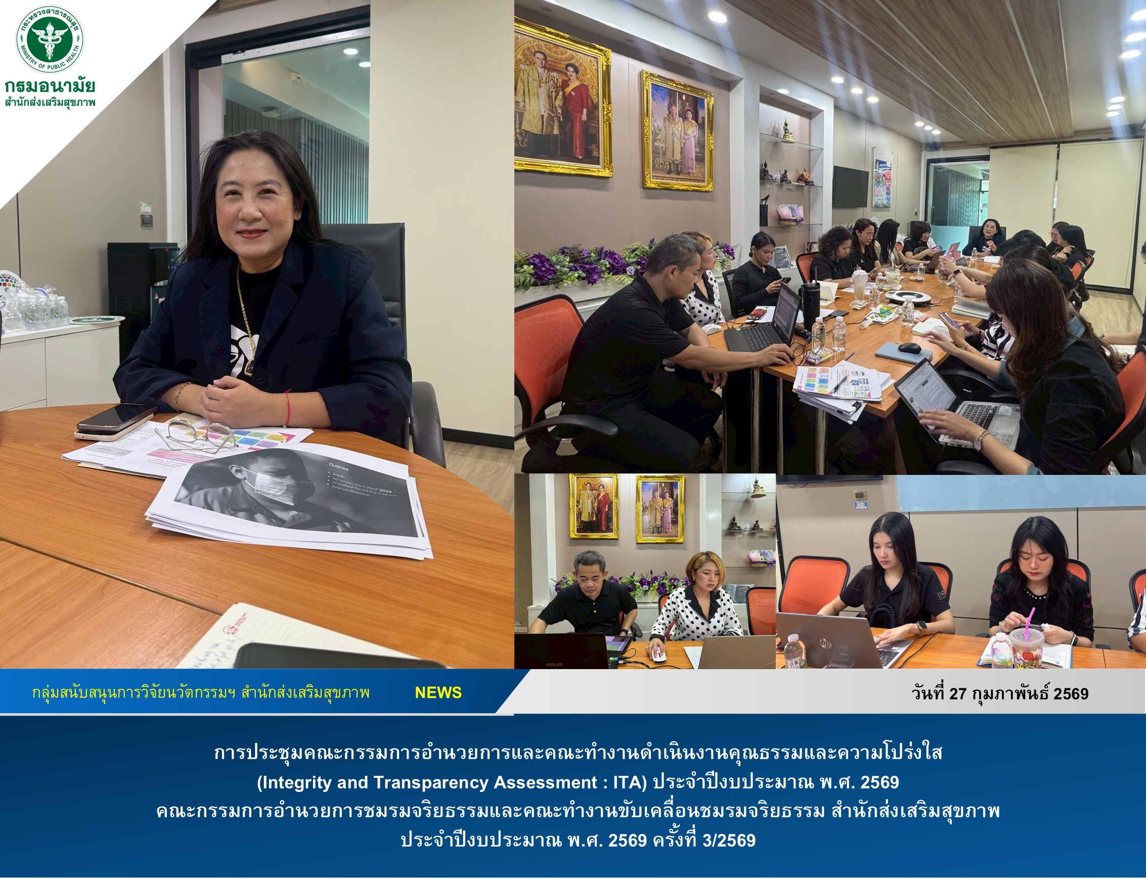 วันนี้ (27 กุมภาพันธ์ 2569) แพทย์หญิงทิพา ไกรลาศ ผู้อำนวยการสำนักส่งเสริมสุขภาพ มอบหมายให้ ทันตแพทย์หญิงศิรดา เล็กอุทัย รองผู้อำนวยการสำนักส่งเสริมสุขภาพ และหัวหน้ากลุ่มสนับสนุนการวิจัยนวัตกรรม และสื่อสารประชาสัมพันธ์ เป็นประธานการประชุมคณะกรรมการอำนวยการและคณะทำงานดำเนินงานคุณธรรมและความโปร่งใส (Integrity and Transparency Assessment : ITA) ประจำปีงบประมาณ พ.ศ. 2569 คณะกรรมการอำนวยการชมรมจริยธรรมและคณะทำงานขับเคลื่อนชมรมจริยธรรม สำนักส่งเสริมสุขภาพ ประจำปีงบประมาณ พ.ศ. 2569 ครั้งที่ 3/2569 ที่จัดขึ้นในวันที่ 27 กุมภาพันธ์ 2569 ณ ห้องประชุมกลุ่มอนามัยวัยเรียนวัยรุ่น ผู้เข้าประชุมประกอบด้วยคณะทำงานและคณะกรรมการ จำนวน 25 คน