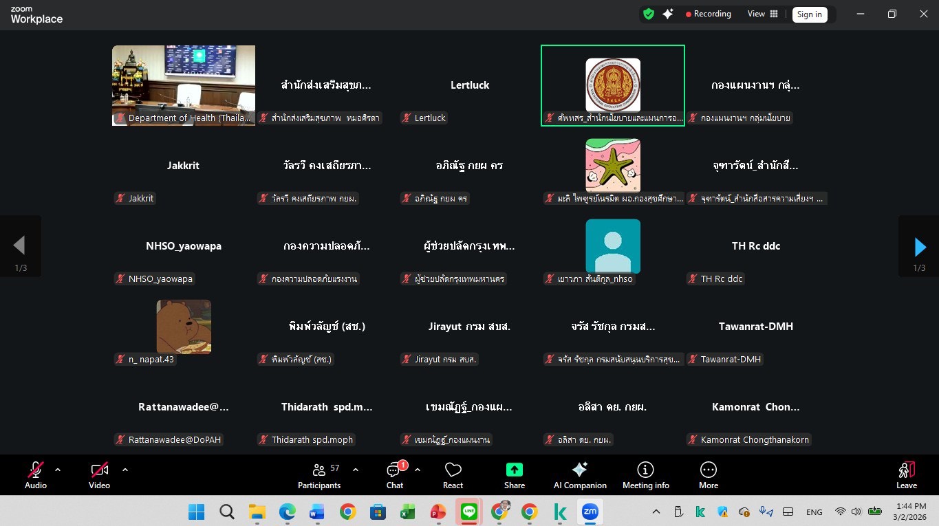 เมื่อวันที่ 2 มีนาคม 2569 แพทย์หญิงทิพา ไกรลาศ ผู้อำนวยการสำนักส่งเสริมสุขภาพ มอบหมายให้ทันตแพทย์หญิงศิรดา เล็กอุทัย ทันตแพทย์เชี่ยวชาญ (ด้านทันตสาธารณสุข) รองผู้อำนวยการสำนักส่งเสริมสุขภาพ และหัวหน้ากลุ่มสนับสนุนการวิจัยนวัตกรรมและสื่อสารประชาสัมพันธ์ เข้าร่วมประชุมหารือการจัดทำแผนปฏิบัติการด้านการสร้างความรอบรู้ด้านสุขภาวะ การป้องกัน และควบคุมปัจจัยเสี่ยงที่คุกคามสุขภาวะแห่งชาติ พ.ศ. 2571 – 2575 ครั้งที่ 1/2569 ผ่านระบบออนไลน์ โดยมีแพทย์หญิงนงนุช ภัทรอนันตนพ รองอธิบดีกรมอนามัย เป็นประธานการประชุม
