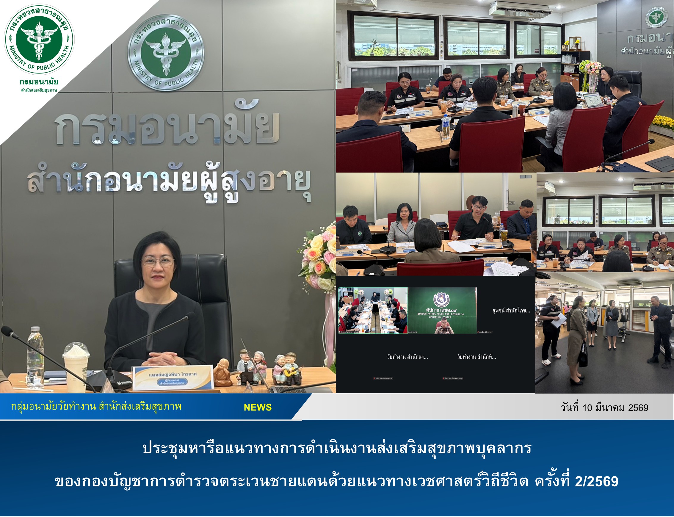 เมื่อวันพุธที่ 10 มีนาคม 2569 สำนักส่งเสริมสุขภาพ จัดประชุมหารือแนวทางการดำเนินงานส่งเสริมสุขภาพบุคลากรของกองบัญชาการตำรวจตระเวนชายแดนด้วยแนวทางเวชศาสตร์วิถีชีวิต ครั้งที่ 2/2569 โดยมีแพทย์หญิงทิพา ไกรลาศ ผู้อำนวยการสำนักส่งเสริมสุขภาพ เป็นประธานในการประชุมครั้งนี้ ผู้เข้าร่วมประชุมประกอบด้วย บุคลากรจากกองบัญชาการตำรวจตระเวนชายแดน และบุคลากรจากสถาบันเวชศาสตร์วิถีชีวิต สำนักส่งเสริมสุขภาพ กองกิจกรรมทางกายเพื่อสุขภาพ สำนักโภชนาการ และสำนักทันตสาธารณสุข เพื่อหารือแนวทางการดำเนินงานฯ เนื้อหาการประชุมฯ ประกอบด้วย