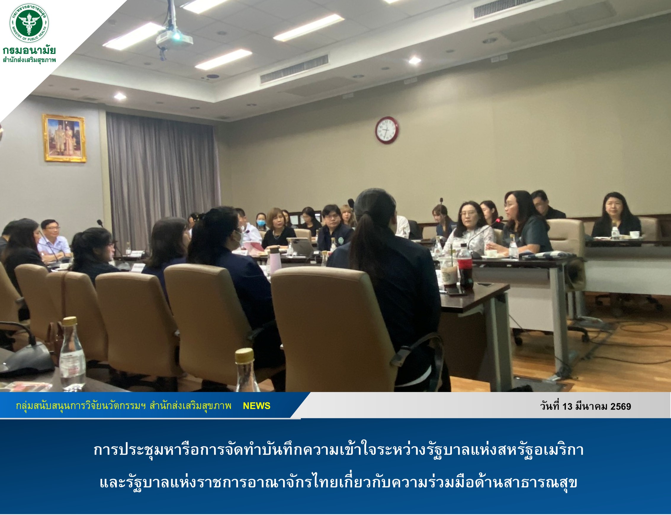 วันนี้ (13 มีนาคม 2569) แพทย์หญิงทิพา ไกรลาศ ผู้อำนวยการสำนักส่งเสริมสุขภาพ มอบหมายให้ทันตแพทย์หญิงศิรดา เล็กอุทัย ทันตแพทย์เชี่ยวชาญ (ด้านทันตสาธารณสุข) รองผู้อำนวยการสำนักส่งเสริมสุขภาพ และหัวหน้ากลุ่มสนับสนุนการวิจัยนวัตกรรม และสื่อสารประชาสัมพันธ์ พร้อมด้วยบุคลากรจากกลุ่มบริหารยุทธศาสตร์และพัฒนากำลังคน เข้าร่วมประชุมหารือการจัดทำบันทึกความเข้าใจระหว่างรัฐบาลแห่งสหรัฐอเมริกาและรัฐบาลแห่งราชการอาณาจักรไทยเกี่ยวกับความร่วมมือด้านสาธารณสุข ณ สำนักงานปลัดกระทรวงสาธารณสุข โดยมีนายแพทย์โสภณ เอี่ยมศิริถาวร รองปลัดกระทรวงสาธารณสุข เป็นประธานการประชุม