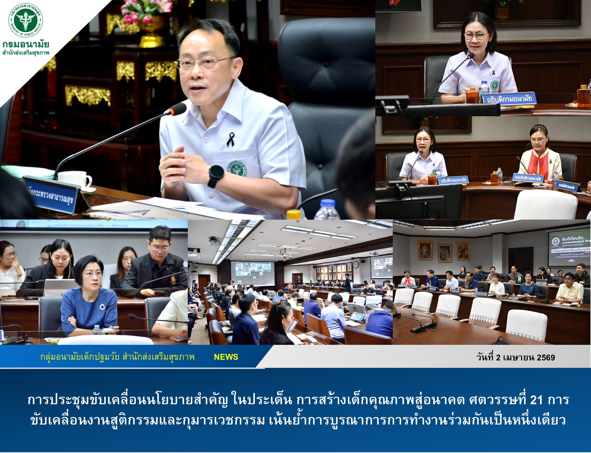 เมื่อวันที่ 2 เมษายน 2569 แพทย์หญิงทิพา ไกรลาศ ผู้อำนวยการส่งเสริมสุขภาพ เข้าร่วมการประชุม ประชุมขับเคลื่อนนโยบายสำคัญ ในประเด็น การสร้างเด็กคุณภาพสู่อนาคต ศตวรรษที่ 21 การขับเคลื่อนงานสูติกรรมและกุมารเวชกรรม เน้นย้ำการบูรณาการการทำงานร่วมกันเป็นหนึ่งเดียว ตลอดจนร่วมกันหาแนวทางรับมือในยุคที่เด็กเกิดน้อย โดยมุ่งยกระดับศักยภาพเด็ก ให้เติบโตเป็นผู้ใหญ่ที่มีศักยภาพ สามารถแข่งขันกับต่างประเทศ มุ่งเน้นการดูแลอย่างต่อเนื่องตั้งแต่แรกเกิดจนถึงวัยรุ่นและวัยผู้ใหญ่ ดำเนินงาน NCDs The series fir Healthy Living in Healthy Cities และการยกระดับสถานบริการการสาธารณสุขคาร์บอนต่ำ รับรองคาร์บอนเครดิต มุ่งสู่ Net Zero ภาคสาธารณสุข