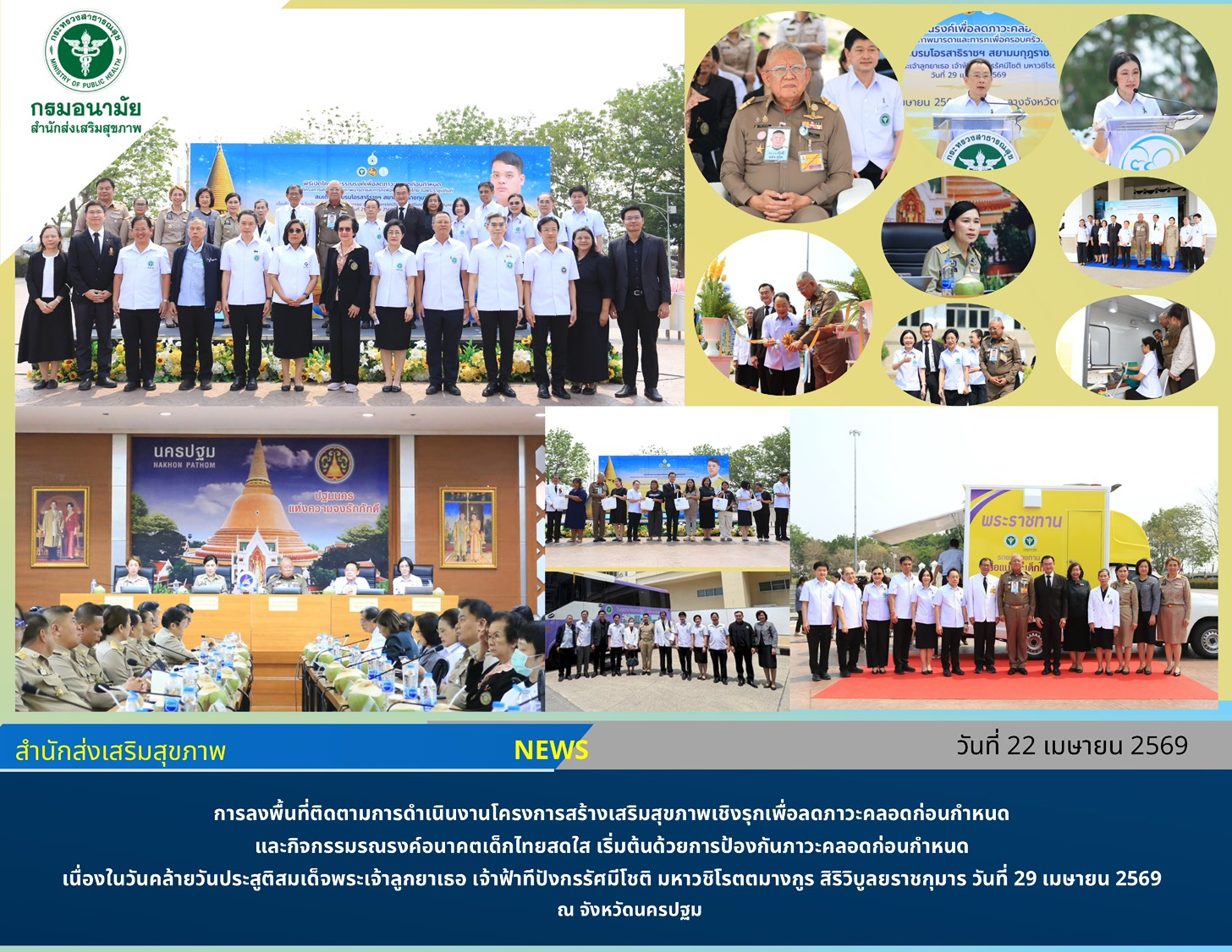 การลงพื้นที่ติดตามการดำเนินงานโครงการสร้างเสริมสุขภาพเชิงรุก เพื่อลดภาวะคลอดก่อนกำหนดและกิจกรรมรณรงค์อนาคตเด็กไทยสดใส เริ่มต้นด้วยการป้องกันภาวะคลอดก่อนกำหนด เนื่องในวันคล้ายวันประสูติสมเด็จพระเจ้าลูกยาเธอ เจ้าฟ้าทีปังกรรัศมีโชติ มหาวชิโรตตมางกูร สิริวิบูลยราชกุมาร วันที่ 29 เมษายน 2569 ในวันพุธที่ 22 เมษายน 2569 ณ พื้นที่จังหวัดนครปฐม
