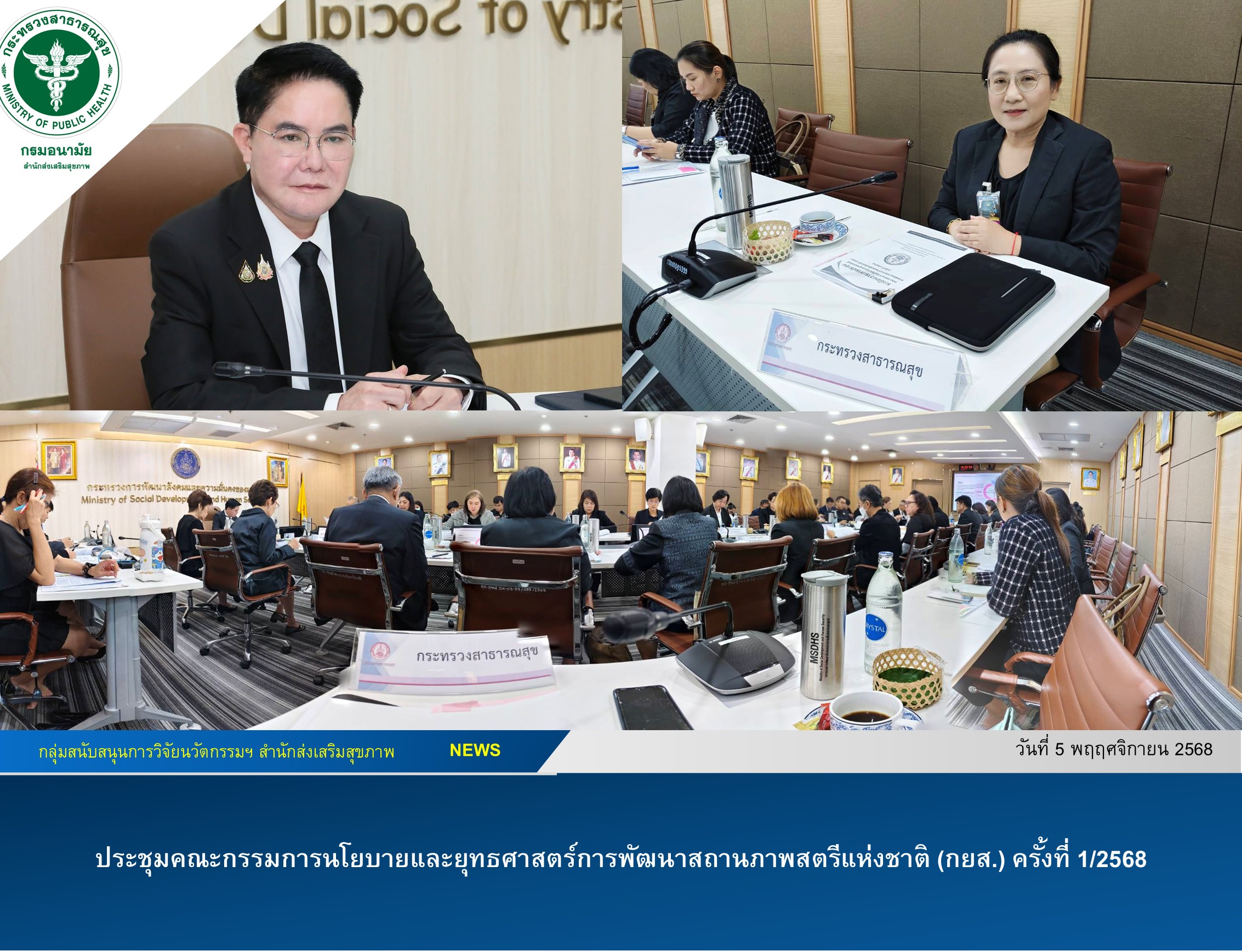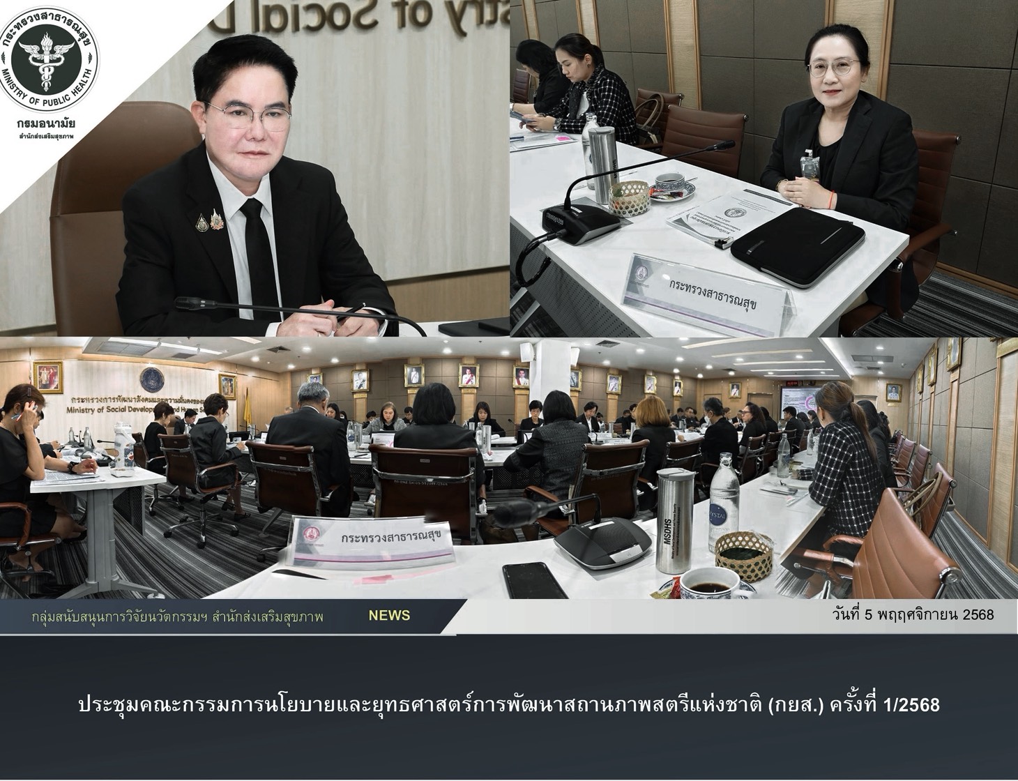วันนี้ (5 พฤศจิกายน 2568) แพทย์หญิงทิพา ไกรลาศ ผู้อำนวยการสำนักส่งเสริมสุขภาพ มอบหมายให้ทันตแพทย์หญิงศิรดา เล็กอุทัย ทันตแพทย์เชี่ยวชาญ (ด้านทันตสาธารณสุข) รองผู้อำนวยการสำนักส่งเสริมสุขภาพ และหัวหน้ากลุ่มสนับสนุนการวิจัยนวัตกรรม และสื่อสารประชาสัมพันธ์ เป็นผู้แทนกระทรวงสาธารณสุข เข้าร่วมประชุมคณะกรรมการนโยบายและยุทธศาสตร์การพัฒนาสถานภาพสตรีแห่งชาติ (กยส.) ครั้งที่ 1/2568 ณ กรมพัฒนาสังคมและสวัสดิการ กระทรวงพัฒนาสังคมและความมั่นคงของมนุษย์ โดยมี นายอัครา พรหมเผ่า รัฐมนตรีว่าการกระทรวงการพัฒนาสังคมและความมั่นคงของมนุษย์ เป็นประธาน การประชุมดังกล่าว มีวัตถุประสงค์เพื่อพิจารณาร่างแผนปฏิบัติการด้านสตรี สันติภาพและความมั่นคง พ.ศ. 2567-2570 และร่างแผนปฏิบัติการเพื่อขจัดความรุนแรงต่อสตรีของประเทศไทย พ.ศ. 2567-2570