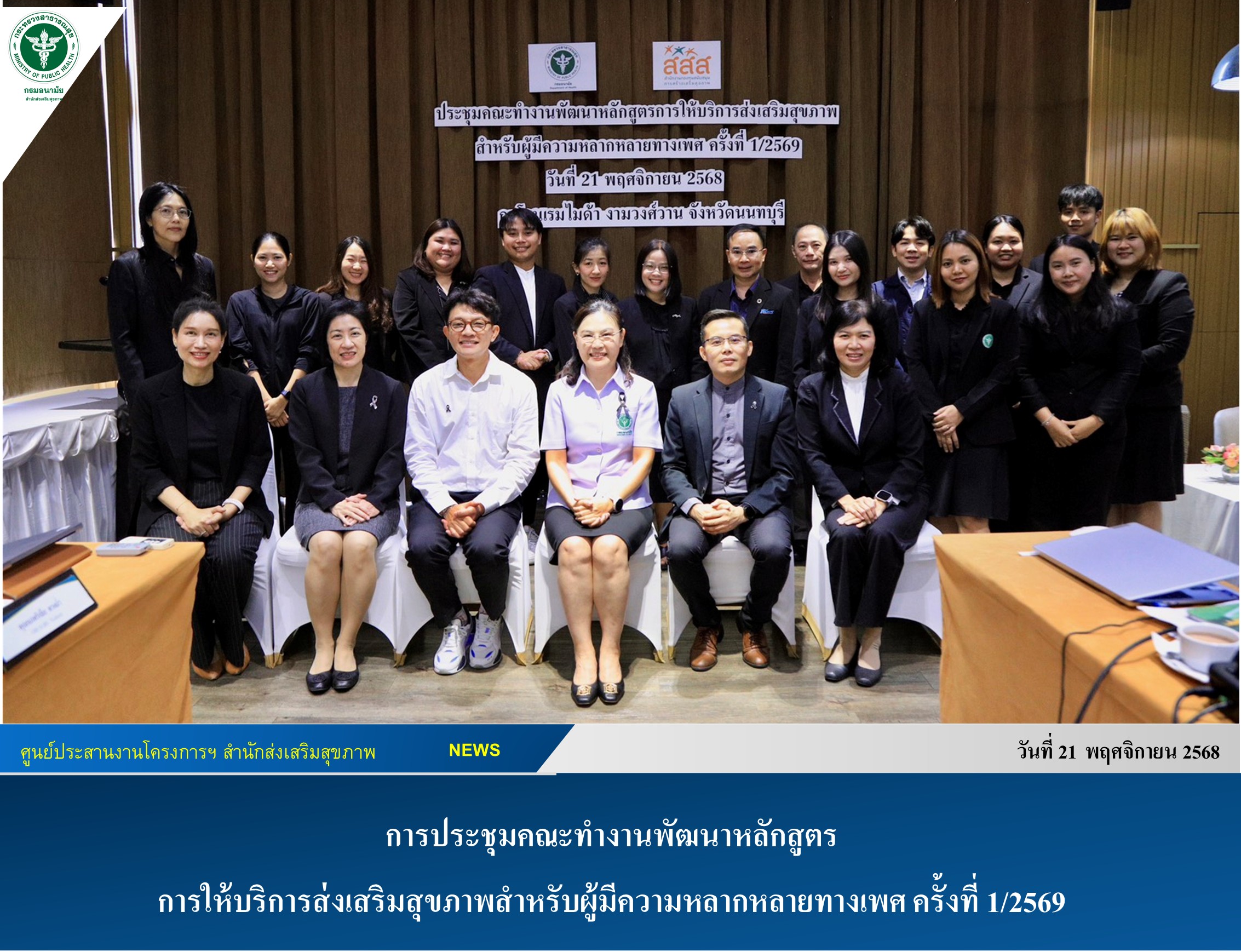 เมื่อวันที่ 21 พฤศจิกายน 2568 แพทย์หญิงนงนุช ภัทรอนันตนพ รองอธิบดีกรมอนามัย เป็นประธานในการประชุมคณะทำงานพัฒนาหลักสูตรการให้บริการส่งเสริมสุขภาพสำหรับผู้มีความหลากหลายทางเพศครั้งที่ 1/2569 ณ โรงแรมไมด้า งามวงศ์วาน จังหวัดนนทบุรี ภายใต้โครงการยกระดับการให้บริการส่งเสริมสุขภาพและเสริมสร้างความรอบรู้ด้านสุขภาพสำหรับผู้มีความหลากหลายทางเพศ (LGBTQ+) โดยมี แพทย์หญิงทิพา ไกรลาศ ผู้อำนวยการสำนักส่งเสริมสุขภาพ กรมอนามัย เป็นรองประธานการประชุม ผู้เข้าร่วมประชุมประกอบด้วย ที่ปรึกษาคณะทำงาน ได้แก่