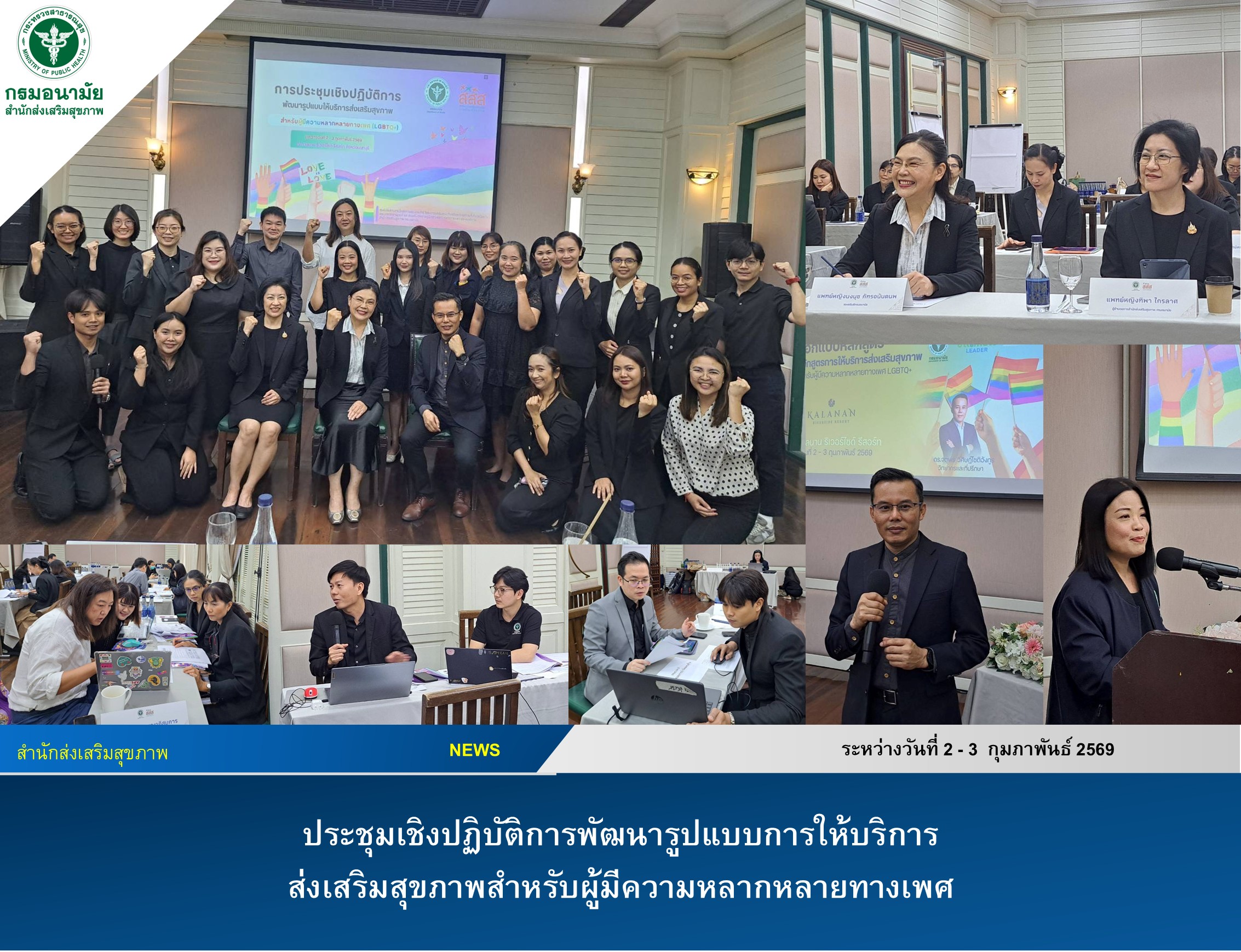 เมื่อวันที่ 3 กุมภาพันธ์ 2569 แพทย์หญิงอัมพร เบญจพลพิทักษ์ อธิบดีกรมอนามัย มอบหมายให้แพทย์หญิงนงนุช ภัทรอนันตนพ รองอธิบดีกรมอนามัย เป็นประธานการประชุมเชิงปฏิบัติการพัฒนารูปแบบการให้บริการส่งเสริมสุขภาพสำหรับผู้มีความหลากหลายทางเพศ ณ กาลนาน ริเวอร์ไซด์ รีสอร์ท จังหวัดนนทบุรี โดยมีแพทย์หญิงทิพา ไกรลาศ ผู้อำนวยการสำนักส่งเสริมสุขภาพ เป็นผู้กล่าวรายงานการประชุม