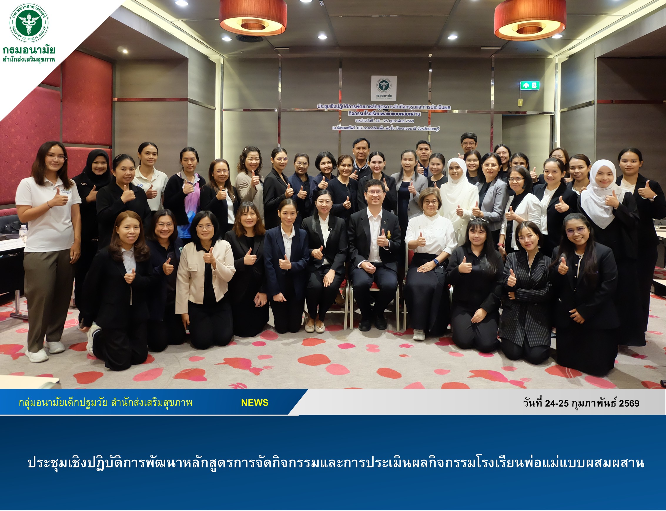 เมื่อระหว่างวันที่ 24-25 กุมภาพันธ์ 2569 สำนักส่งเสริมสุขภาพจัดประชุมเชิงปฏิบัติการพัฒนาหลักสูตรการจัดกิจกรรมและการประเมินผลกิจกรรมโรงเรียนพ่อแม่แบบผสมผสาน โดยมีนายแพทย์สุรัตน์ ผิวสว่าง รองผู้อำนวยการสำนักส่งเสริมสุขภาพ กล่าวต้อนรับและเป็นประธานการประชุม ณ ห้องแซฟไฟร์ 107 อาคารอิมแพ็ค ฟอรั่ม เมืองทองธานี จังหวัดนนทบุรี และได้รับเกียรติจากผู้ช่วยศาสตราจารย์ (พิเศษ) แพทย์หญิงนัยนา ณีศะนันท์ สถาบันเด็กแห่งชาติมหาราชินี และ แพทย์หญิงสิฏฐินิดา กิตติศิริวัฒนกุล กองส่งเสริมความรอบรู้และสื่อสารสุขภาพ ร่วมวิพากษ์และให้ข้อเสนอแนะหลักสูตรการจัดกิจกรรมและการประเมินผลกิจกรรมโรงเรียนพ่อแม่แบบผสมผสาน