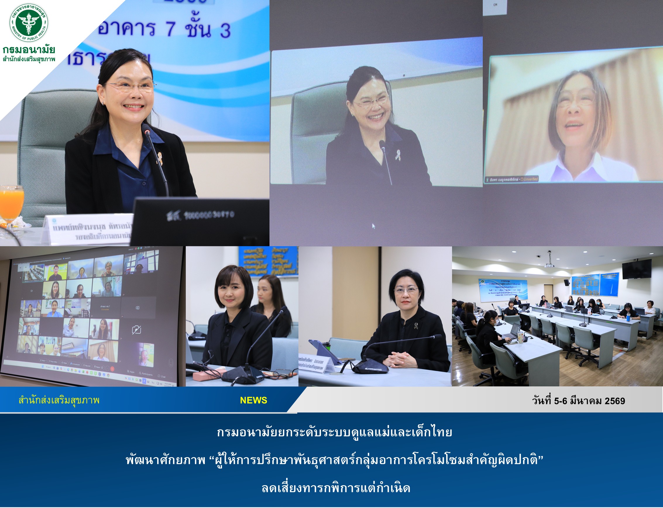 กรมอนามัย กระทรวงสาธารณสุข เดินหน้าพัฒนาศักยภาพบุคลากรสาธารณสุข ด้านการให้คำปรึกษาทางพันธุศาสตร์ จัดประชุมเชิงปฏิบัติการ “พัฒนาศักยภาพผู้ให้การปรึกษาทางพันธุศาสตร์กลุ่มอาการโครโมโซมสำคัญผิดปกติ (Major Autosomal Aneuploidy)” ระหว่างวันที่ 5 – 6 มีนาคม 2569 ในระบบอนนไลน์ (Webex) โดยมีแพทย์หญิงหญิงอัมพร เบญจพลพิทักษ์ อธิบดีกรมอนามัย กล่าวต้อนรับและเปิดการประชุม เพื่อเสริมองค์ความรู้และทักษะให้บุคลากรทางการแพทย์และสาธารณสุขทั่วประเทศ สามารถให้คำปรึกษาหญิงตั้งครรภ์ก่อนและหลังการตรวจคัดกรองกลุ่มอาการดาวน์ และครอบครัวได้อย่างถูกต้องครบถ้วน สนับสนุนการตั้งครรภ์ที่มีคุณภาพลดความเสี่ยงการเกิดทารกที่มีความผิดปกติทางโครโมโซม และส่งเสริมให้เด็กไทยเกิดมาแข็งแรงมีพัฒนาการสมวัย