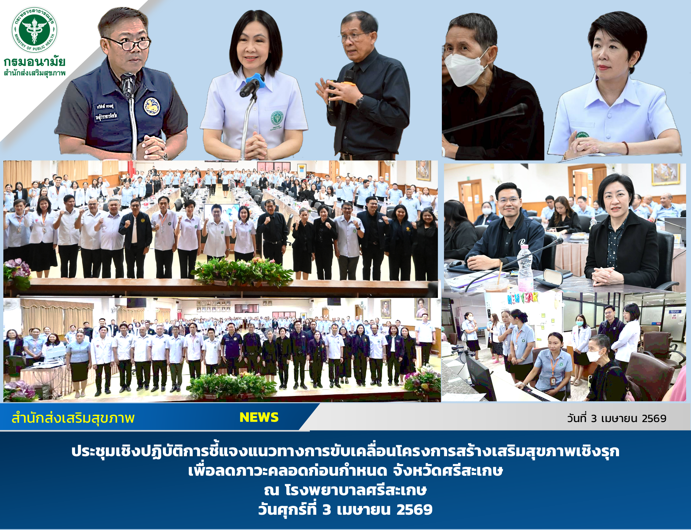 วันนี้ (3 เมษายน 2569) แพทย์หญิงอัมพร เบญจพลพิทักษ์ อธิบดีกรมอนามัย เข้าร่วมประชุมเชิงปฏิบัติการชี้แจงแนวทางการขับเคลื่อนโครงการสร้างเสริมสุขภาพเชิงรุกเพื่อลดภาวะคลอดก่อนกำหนด จังหวัดศรีสะเกษ ณ โรงพยาบาลศรีสะเกษ โดยมี นายทวีศักดิ์ ทรงอยู่ รองผู้ว่าราชการจังหวัดศรีสะเกษ ให้เกียรติกล่าวต้อนรับ