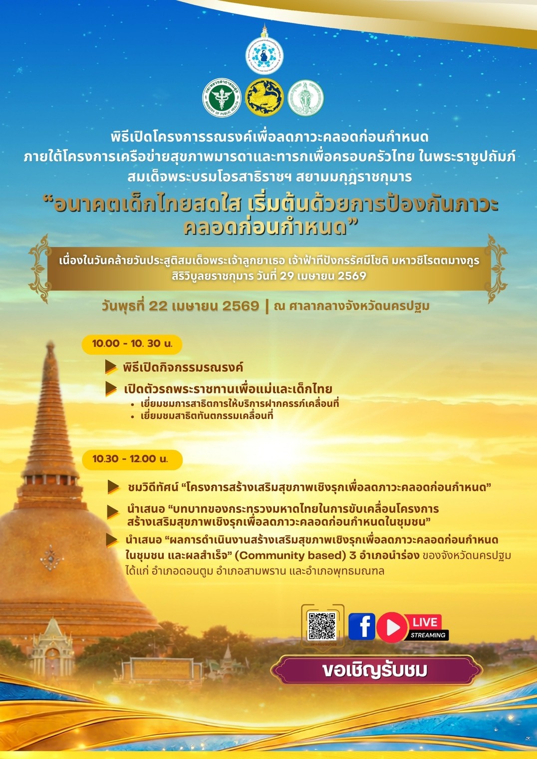 ธีเปิดโครงการรณรงค์เพื่อลดภาวะคลอดก่อนกำหนด ภายใต้โครงการเครือข่ายสุขภาพมารดาและทารกเพื่อครอบครัวไทย ในพระราชอุปถัมภ์ฯ