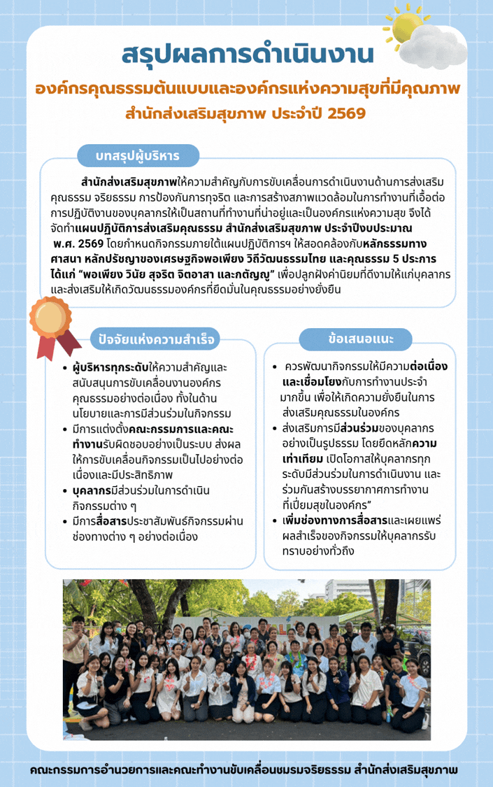 ความสำเร็จเหล่านี้เกิดจากปัจจัยสำคัญคือ “การมีส่วนร่วมของบุคลากรทุกระดับ” โดยมีผู้บริหารเป็นแบบอย่างและให้การสนับสนุนอย่างต่อเนื่อง สำนักส่งเสริมสุขภาพพร้อมแล้วที่จะเป็นฟันเฟืองสำคัญในการขับเคลื่อนสังคมไทยด้วยคุณธรรม และสร้างมาตรฐานองค์กรแห่งความสุขที่มีคุณภาพอย่างเป็นรูปธรรม